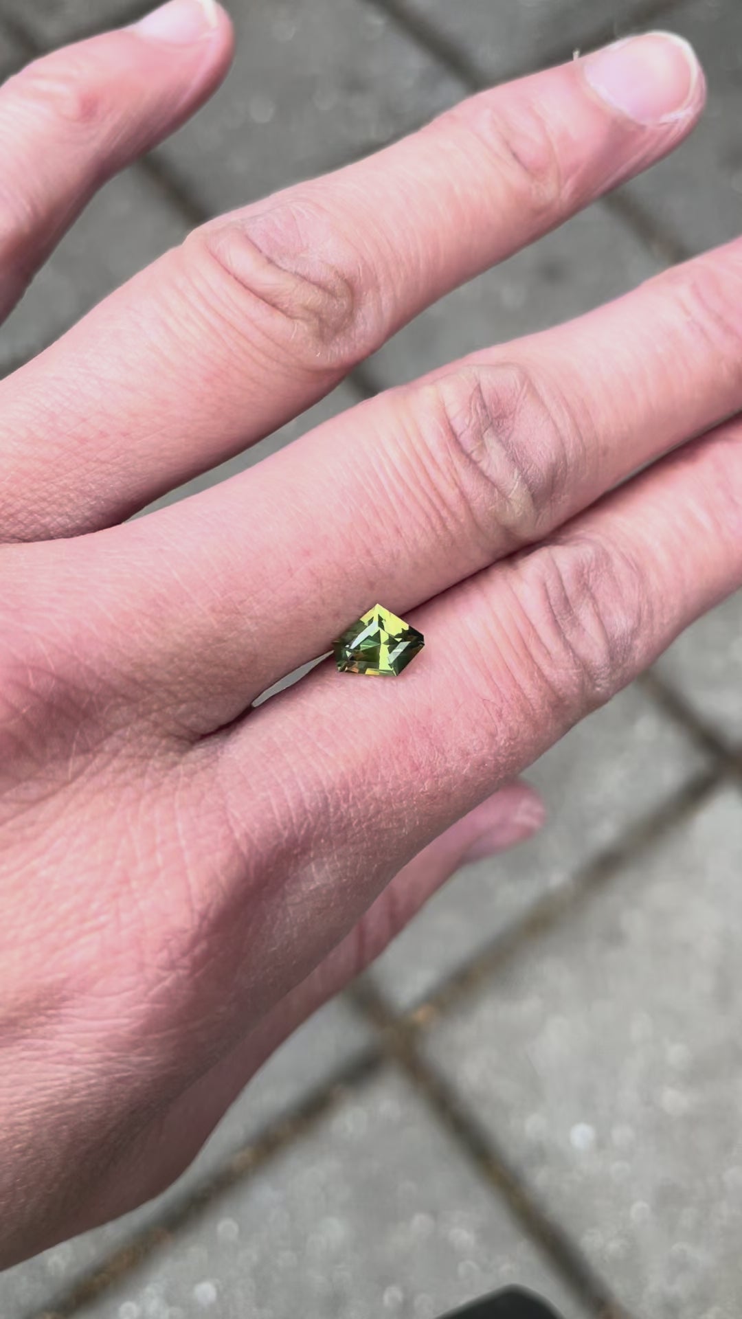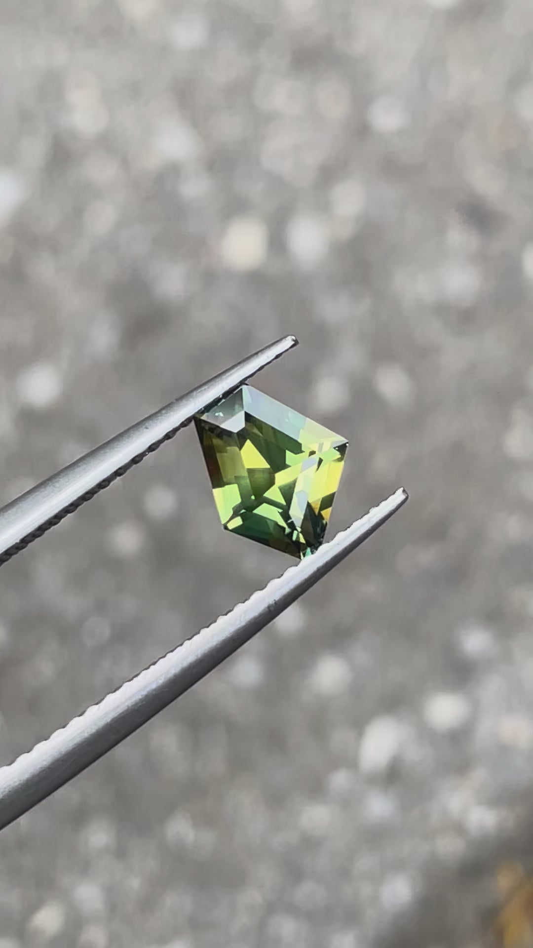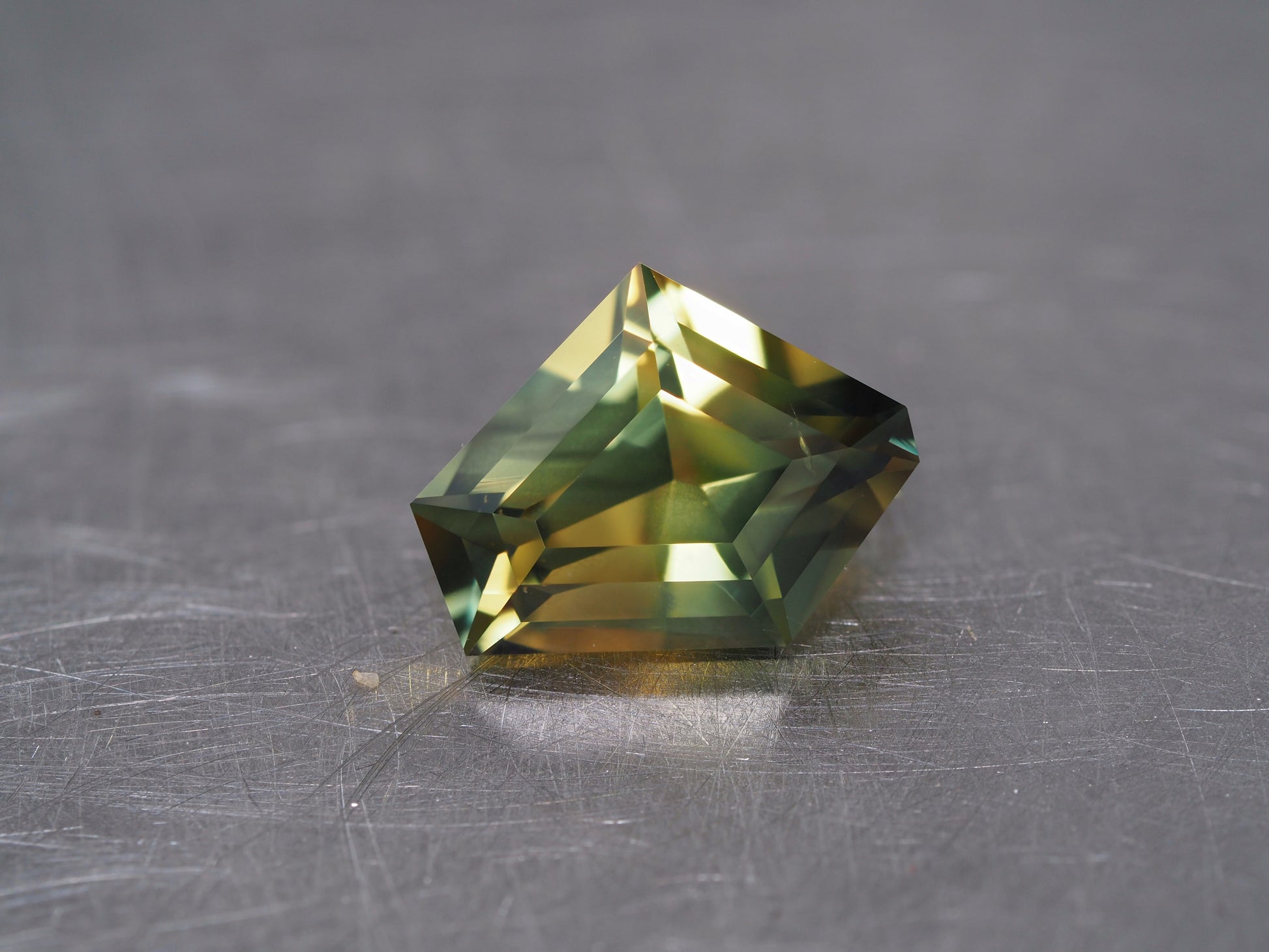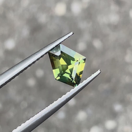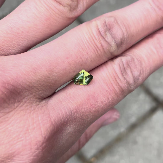 A beautiful yellow and green parti sapphire cut into a freeform shape that follows the lines of the natural rough crystal.